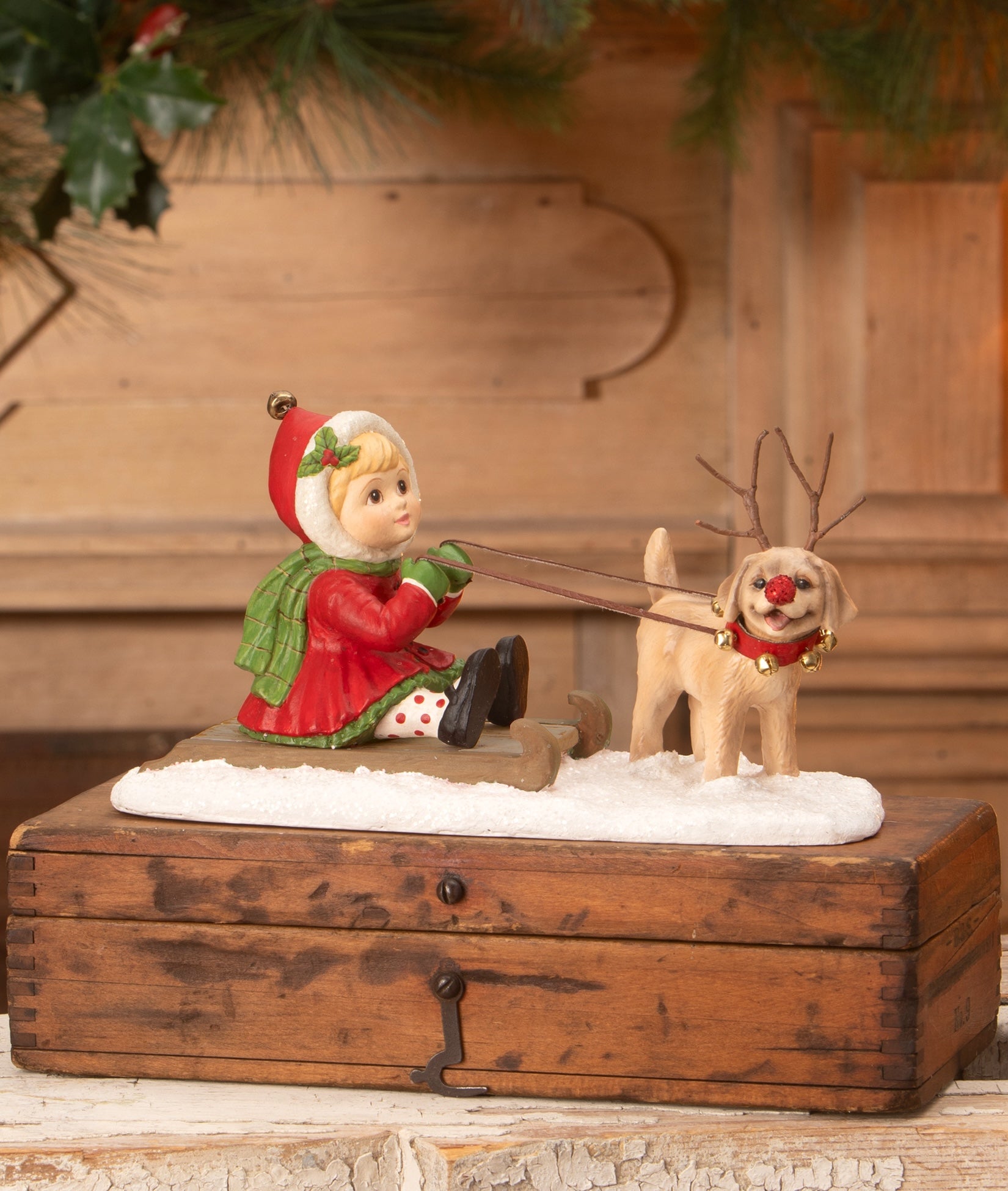 Little Clare is having the best snow day ever! Bundled in her red coat and green scarf, she sleds through glistening snow with her playful pup leading the way. Dressed as Rudolph with jingle bells, a red nose, and tiny wire antlers, her puppy adds a whimsical touch that brings your Christmas display to life.