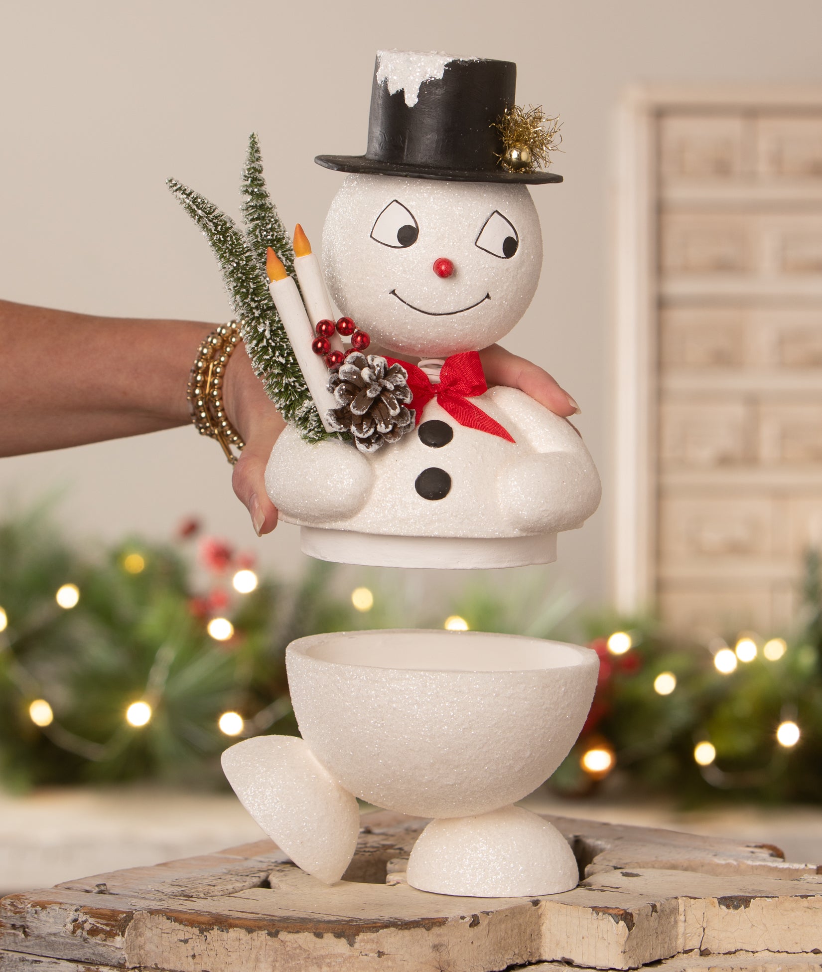 Create a magical Christmas scene with this cute nostalgic Jolly Bobble Snowman Container, sure to make happy faces.