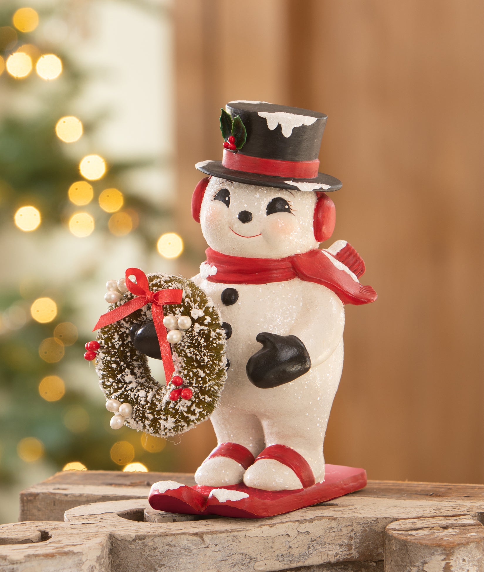 With skis on his feet and a bottle brush wreath in hand, he’s ready to glide straight into the heart of your holiday decor.