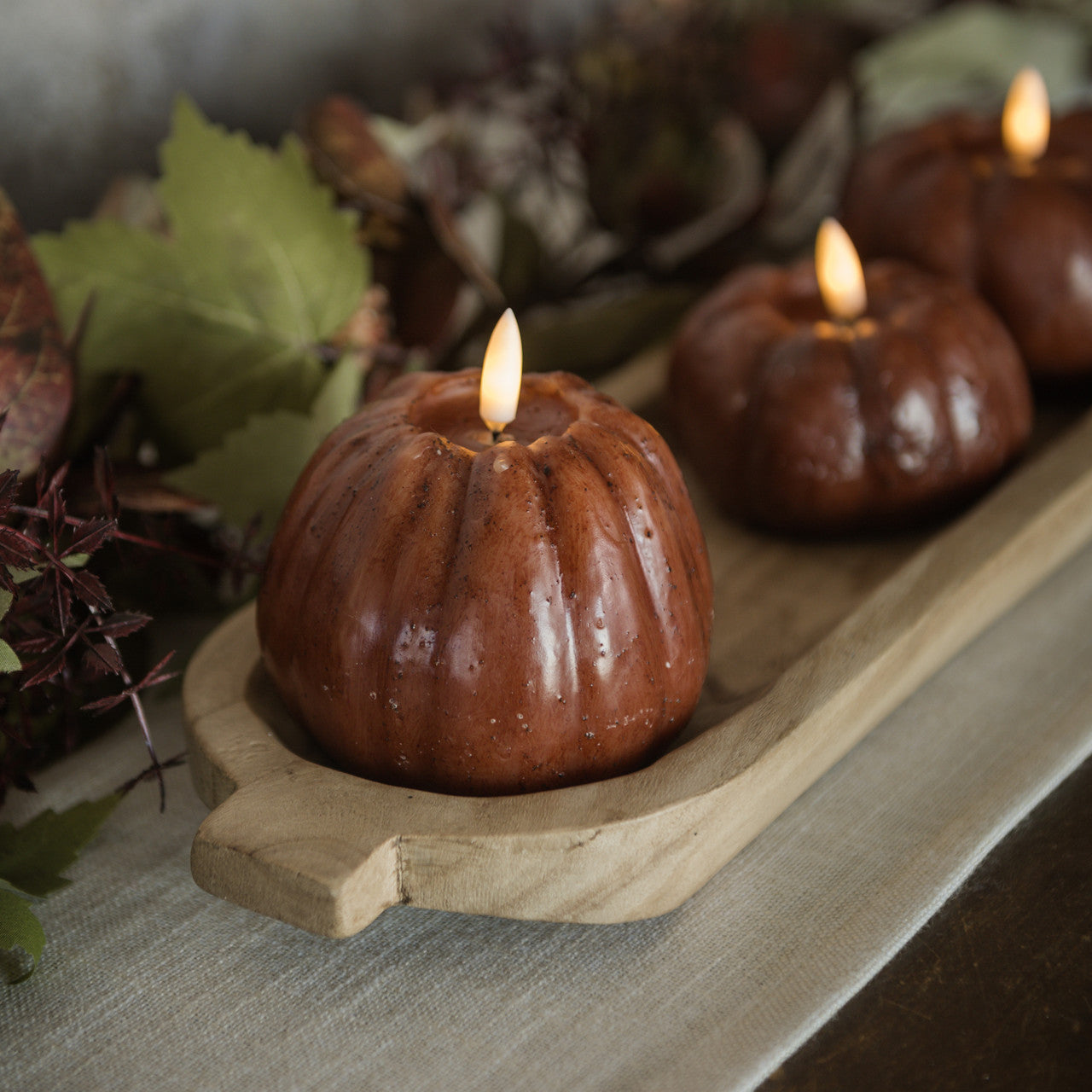 Bring the glow of autumn into your home with these ginger brown flameless pumpkin candles, available in three charming sizes and shapes. Each one is finished with subtle texture and an aged wash that gives it unique character.