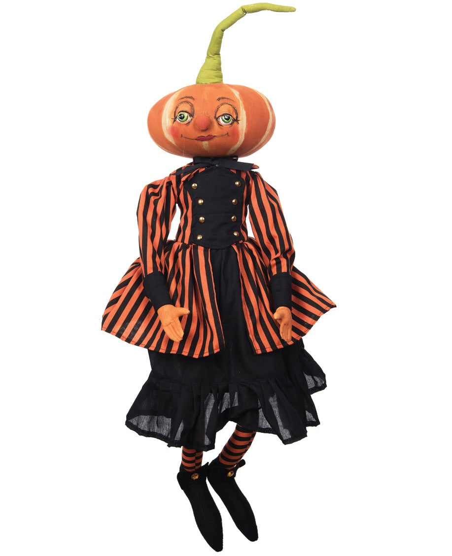 With a swirl of vintage carnival flair and just the right touch of mischief, Padma Pumpkin is ready to be the star of your fall decorating scene. Designed by renowned folk artist Joe Spencer, this 30-inch Halloween doll features a classic pumpkin head, expressive painted face, and a stunning black-and-orange striped dress with gold button details.