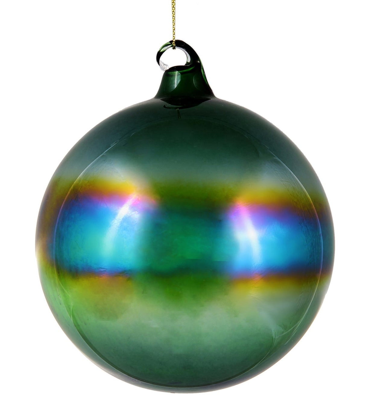 Transform your holiday decorations into a designer masterpiece with these transparent Jim Marvin Dark Green Bottle Glass Ball Ornaments. Their striking, iridescent finish will add shimmer and shine to your holiday decor.