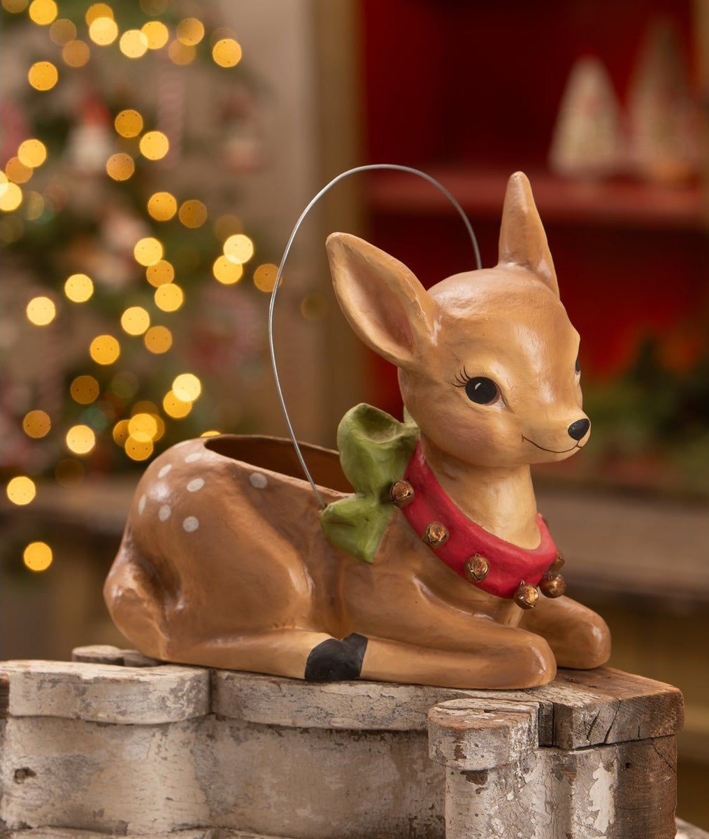 This sweet paper mache reindeer rests in a gentle pose, wearing a red collar trimmed with jingle bells and a big green bow at the back. Jingle Bell Reindeer Bucket is a cheerful Christmas piece that adds a fun, festive touch to any holiday display.