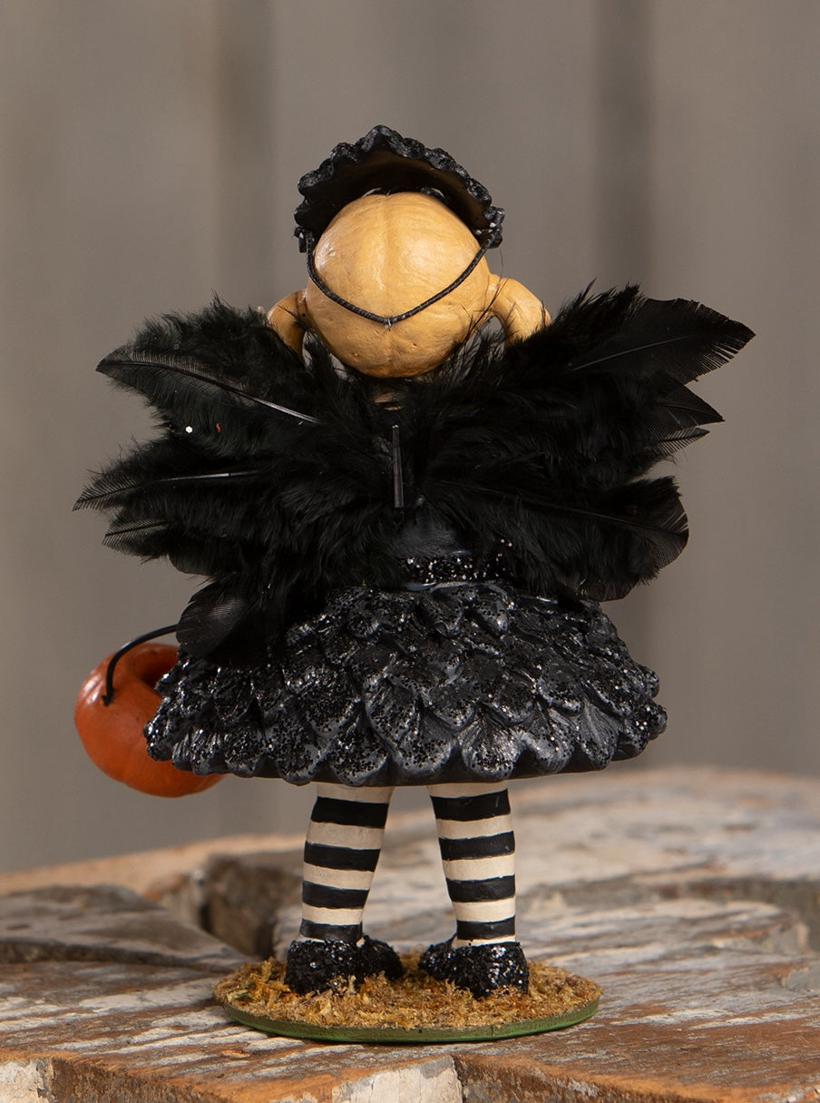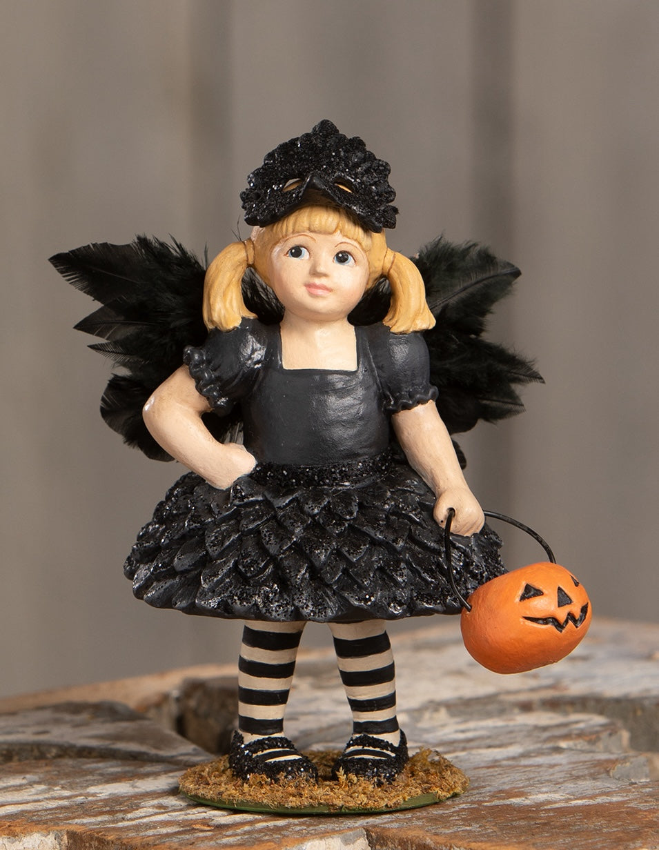 Dressed in her finest feathered costume, Hazel is ready to take flight into Halloween night. Her glittered black skirt shimmers with every step, while sculpted wings and striped leggings complete her whimsical crow-inspired look. Tucked under her arm is a bright orange pumpkin bucket, ready to be filled with spooky-sweet treats.