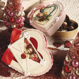 • 2 - Assorted pressed paper heart shaped boxes with victorian paper images. Ribbon, glitter, and silk flower accents.